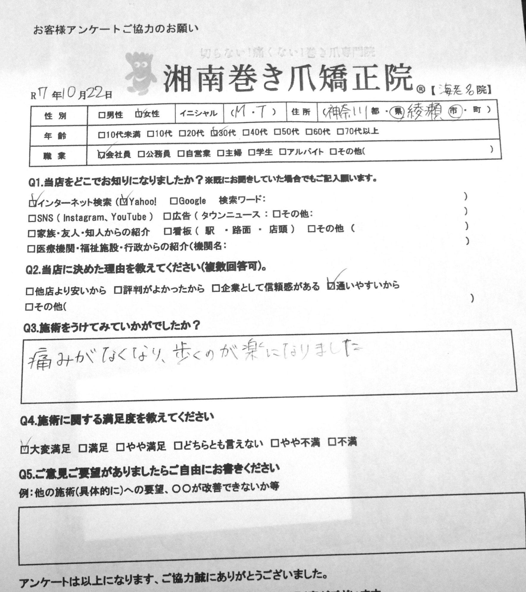 また、巻き爪矯正施術後の率直なお声をお寄せいただき、重ねて御礼申し上げます。